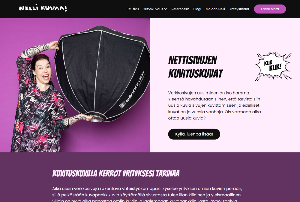 Yritysten valokuvauksiin erikoistunut valokuvaaja Nelli Kivinen otti minuun yhteyttä kesäkuussa 2024 ja kertoi tarvitsevansa apua kotisivujen uudistuksen kanssa. Nelli oli tehnyt vanhat sivunsa itse, mutta tällä kertaa hän halusi ulkoistaa työn kotisivujen ammattilaiselle.