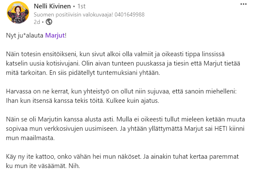 "Vuosikausien tuskailu omien verkkosivujen kanssa loppui, kun Marjut teki mulle uudet kotisivut. Uudet kotisivuni on hakukoneoptimoitu todella hyvin, näyttävät ja kuulostavat minulta ja erottuvat kilpailijoistani.